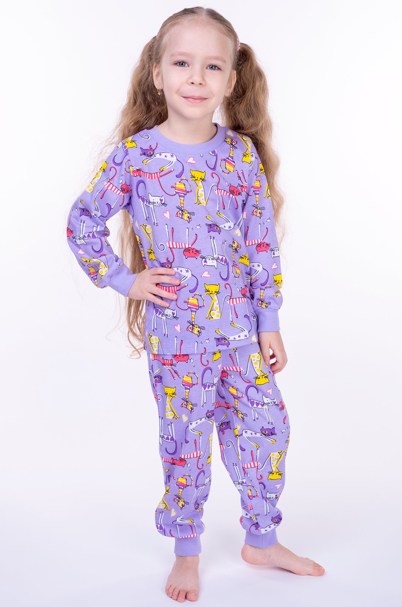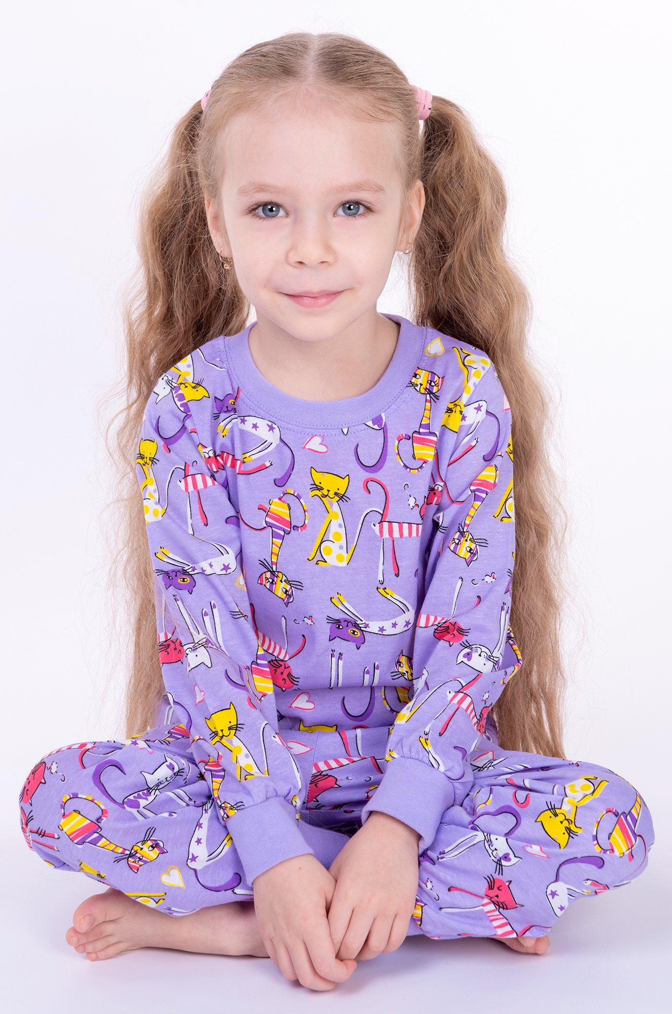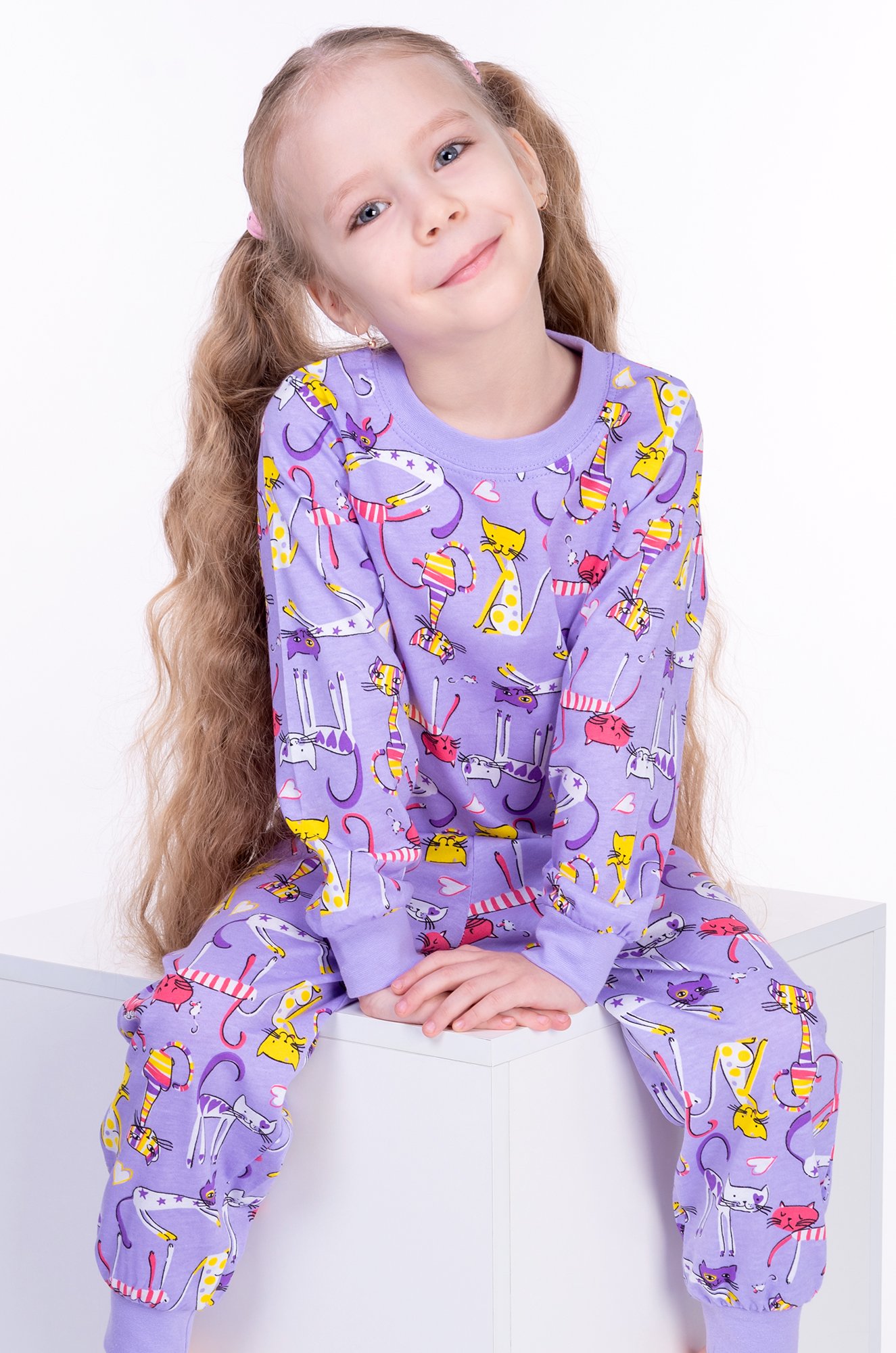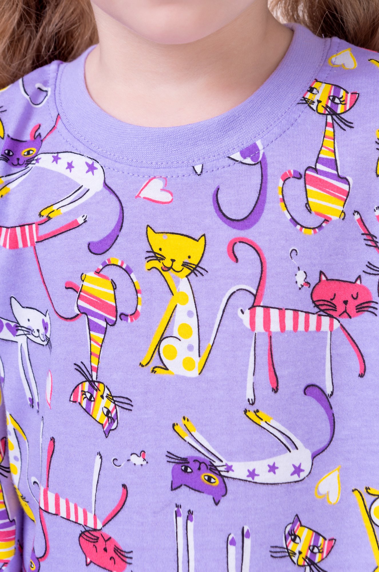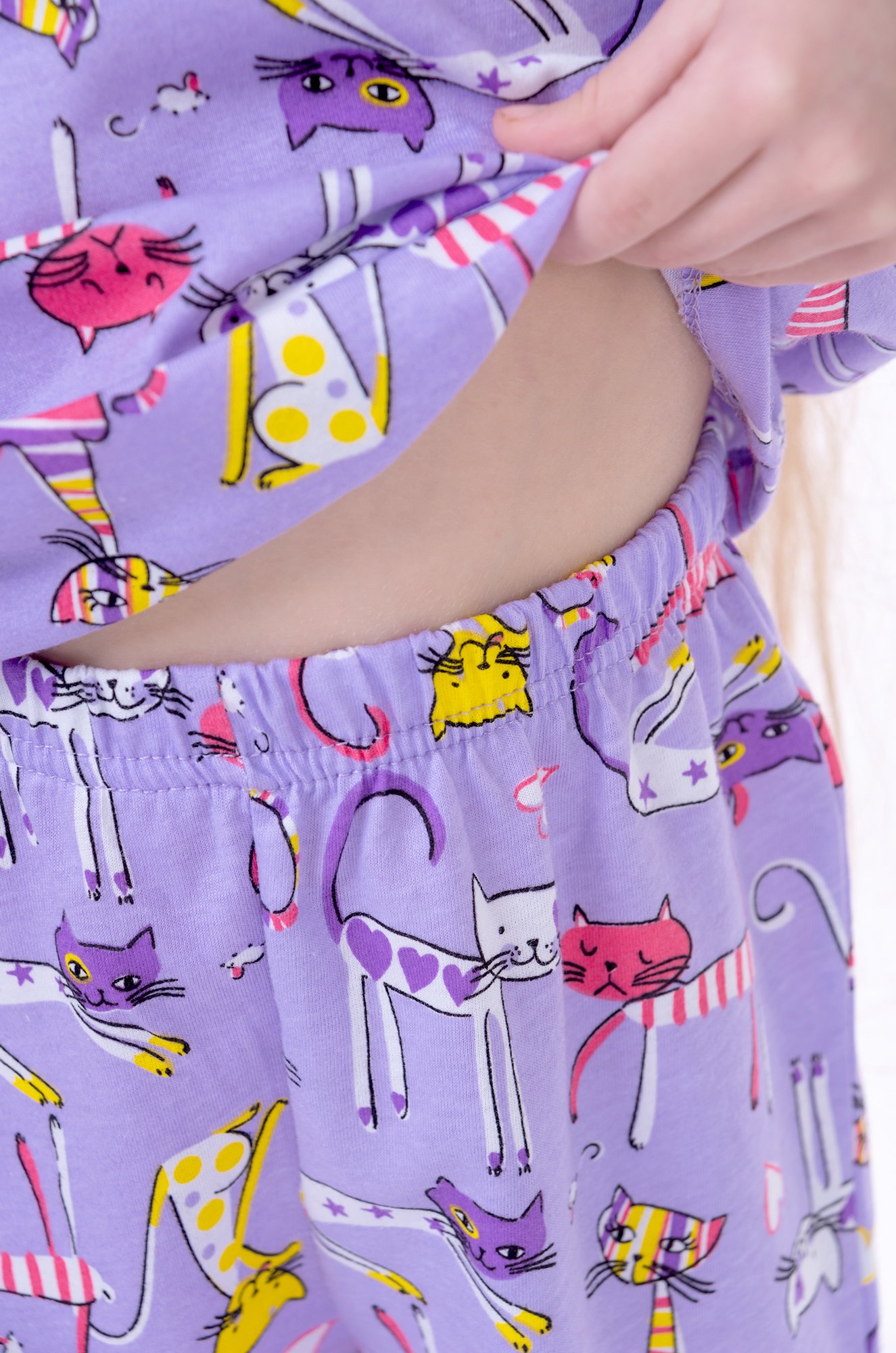Пижама для девочки выполнена из 100% хлопкового полотна кулирная гладь. Детский домашний костюм декорирован набивным принтом разноцветные кошки.