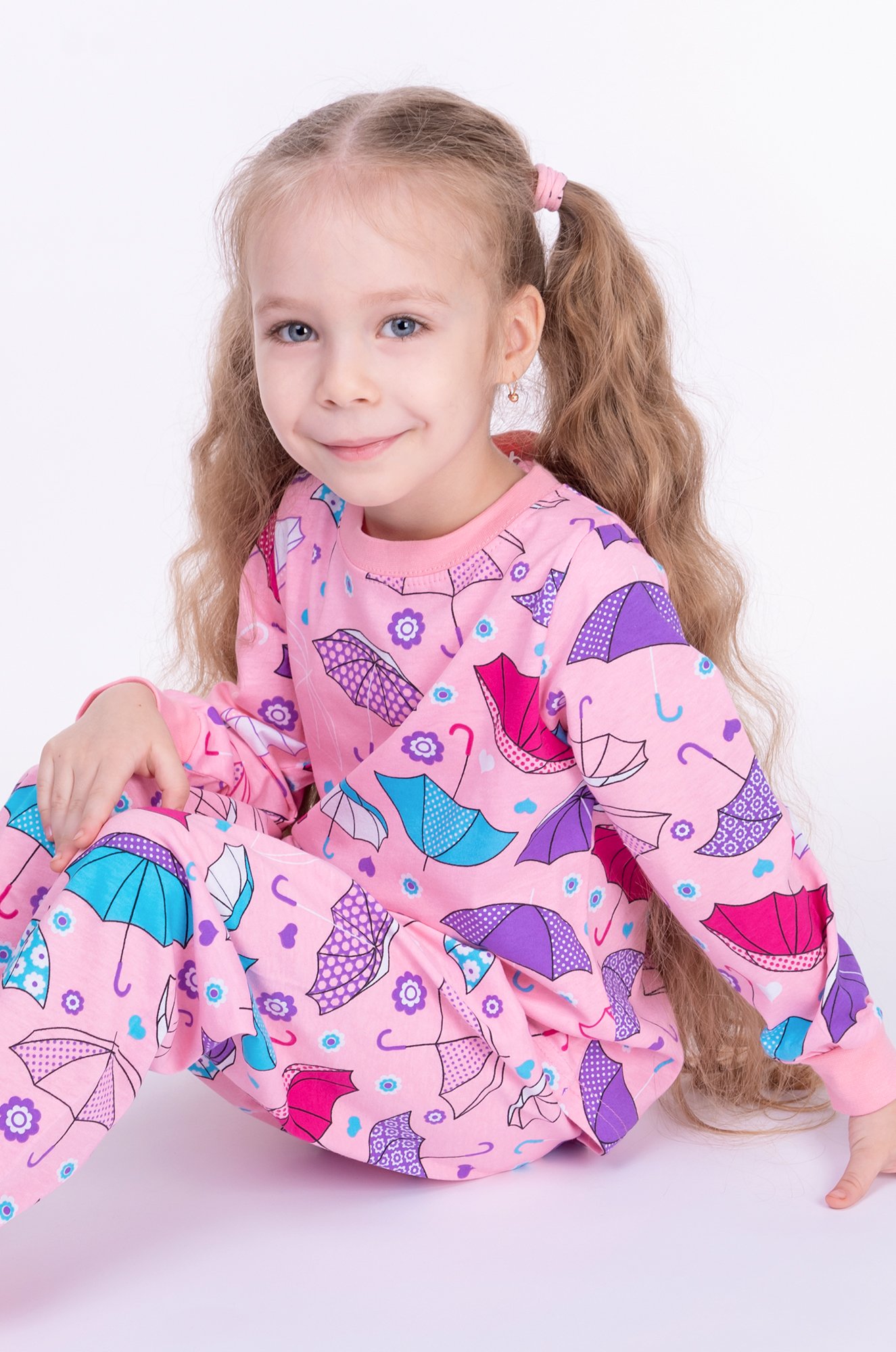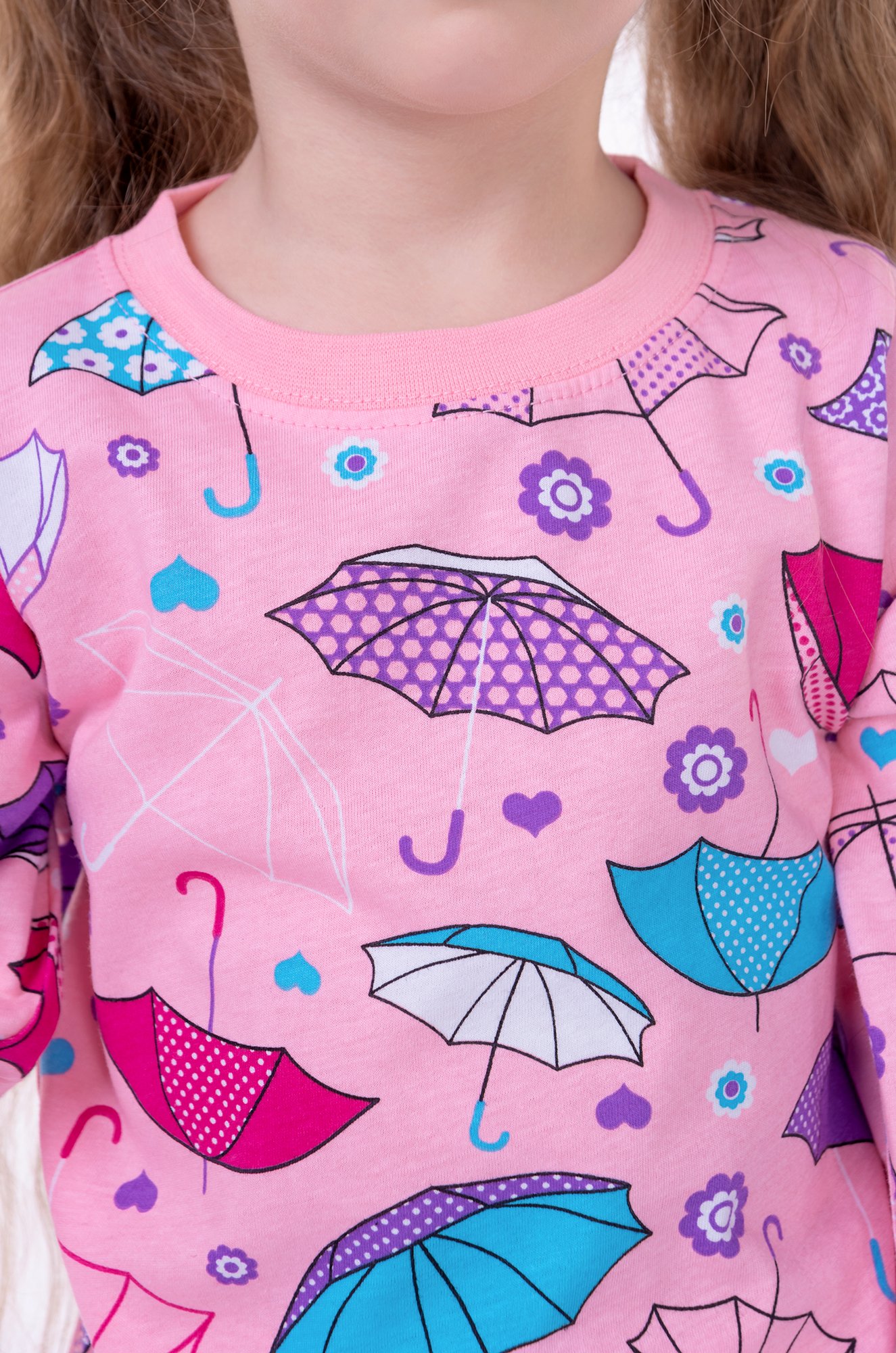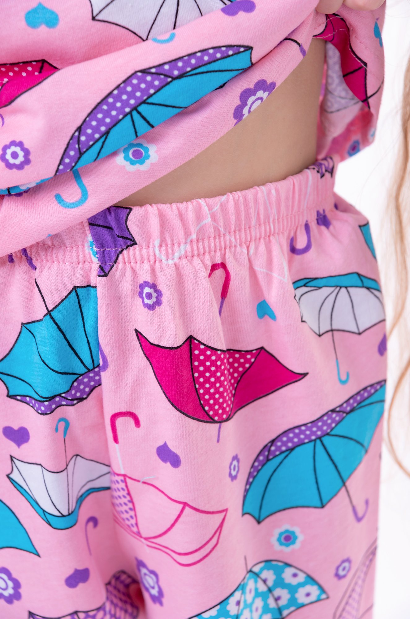 Пижама для девочки выполнена из 100% хлопкового полотна кулирная гладь. Детский домашний костюм декорирован набивным принтом цветные зонтики.