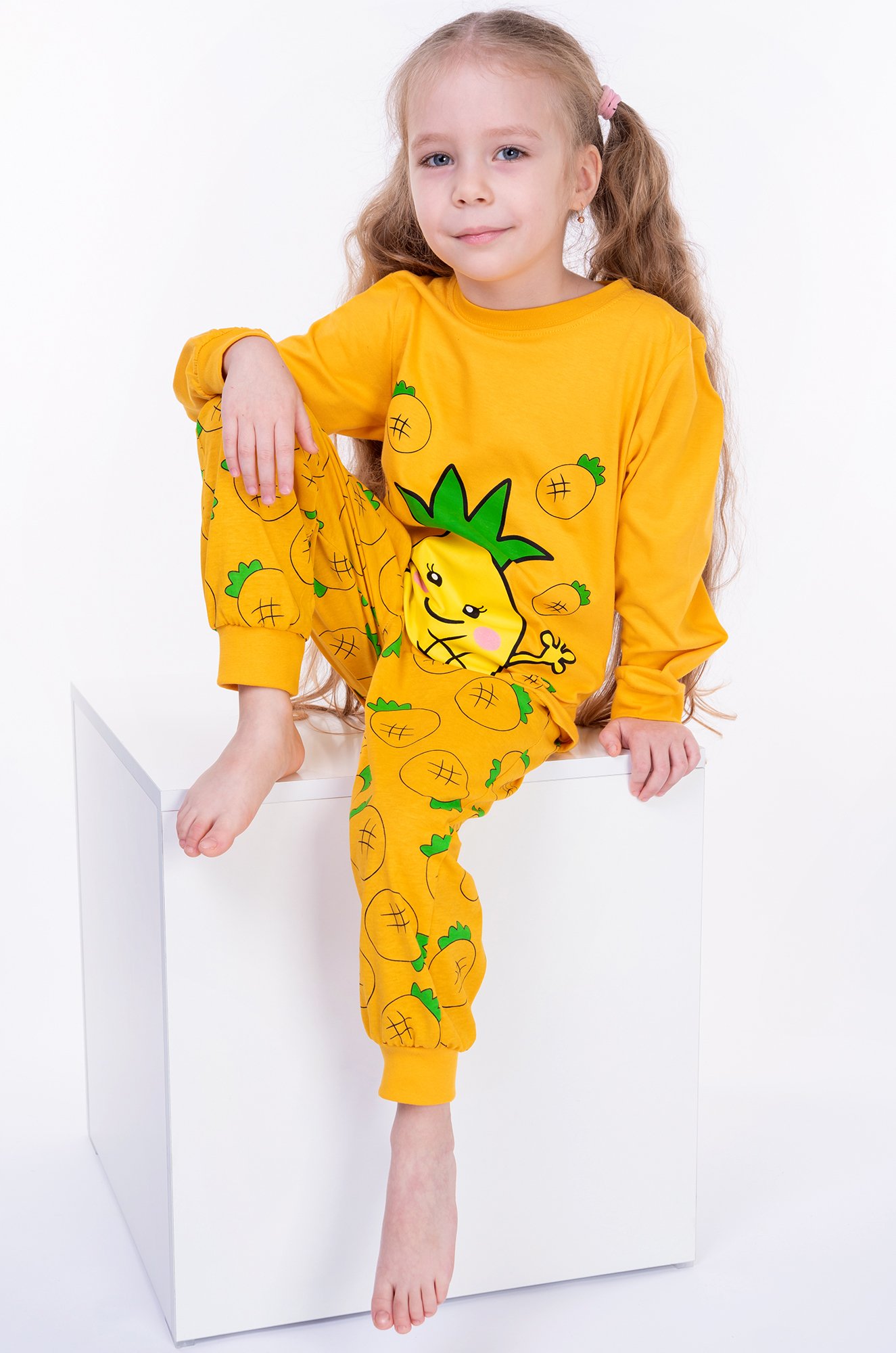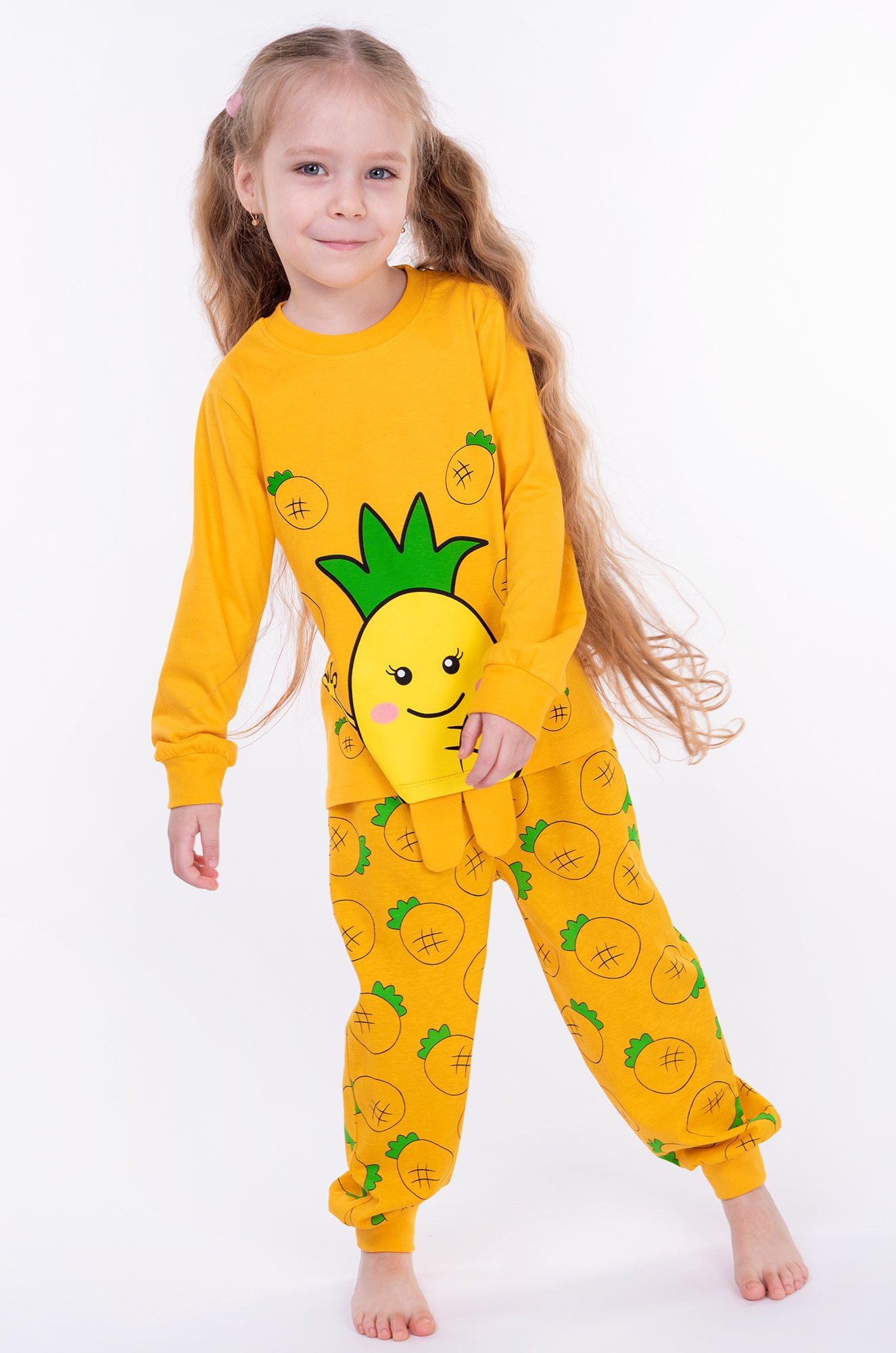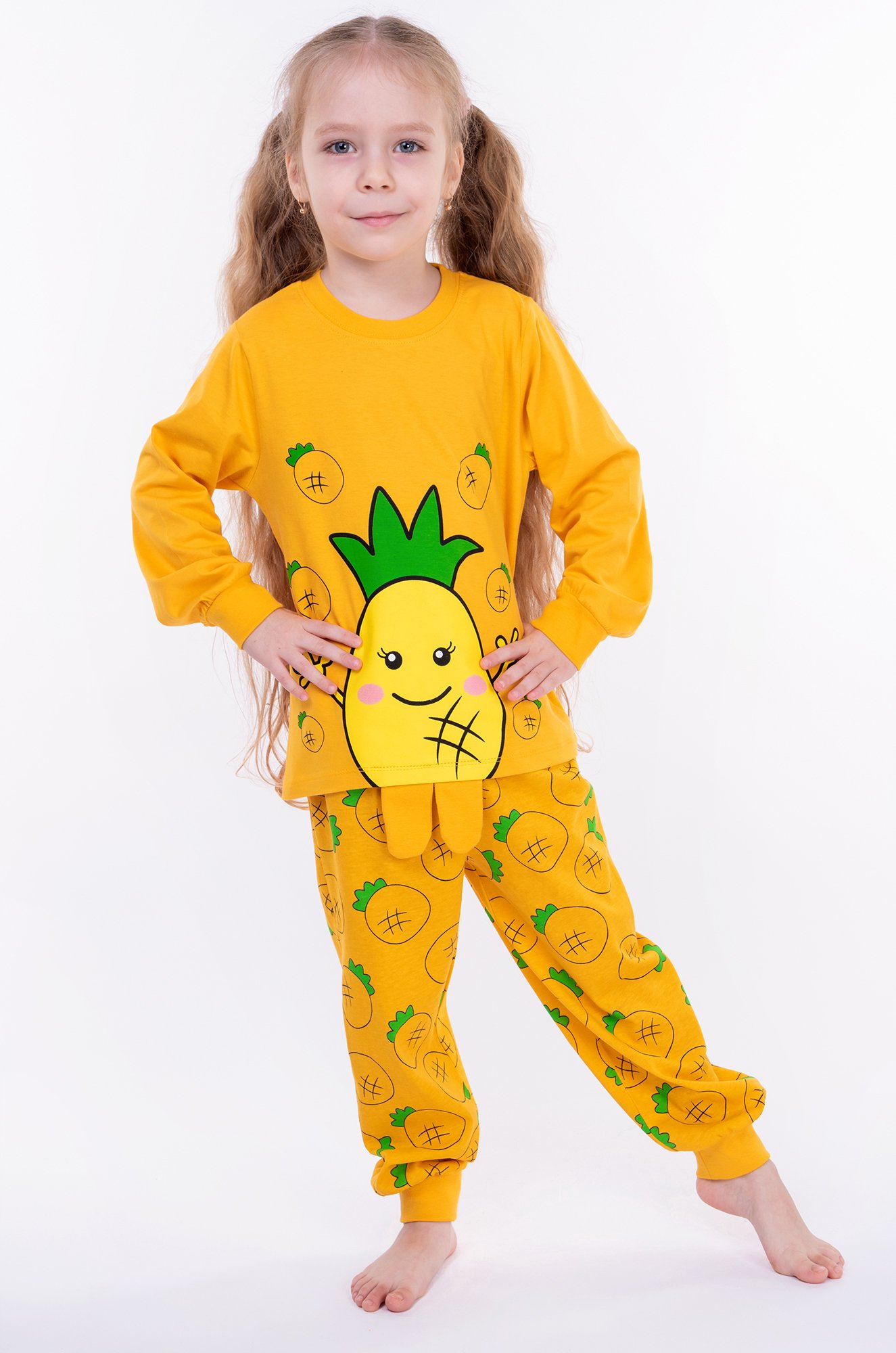 Мягкая пижама для девочки сшита из трикотажа кулирная гладь. Приятный на ощупь 100% хлопок позволяет нежной коже дышать, прекрасно держит форму, сохраняет цвет даже после многочисленных стирок. Домашний костюм выполнен в желтом цвете и украшен милым принтом ананасы.