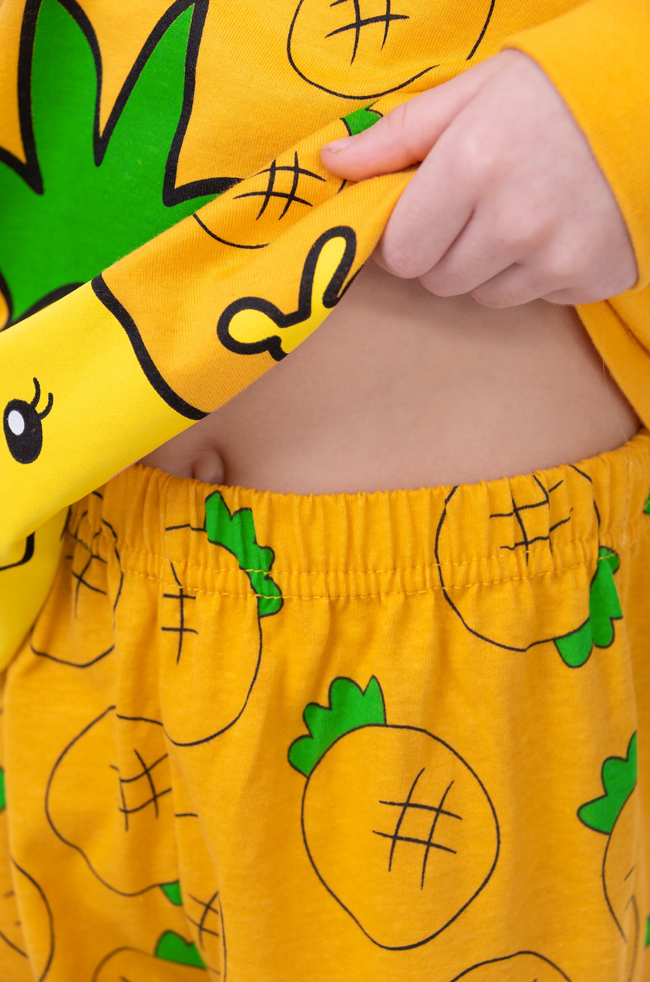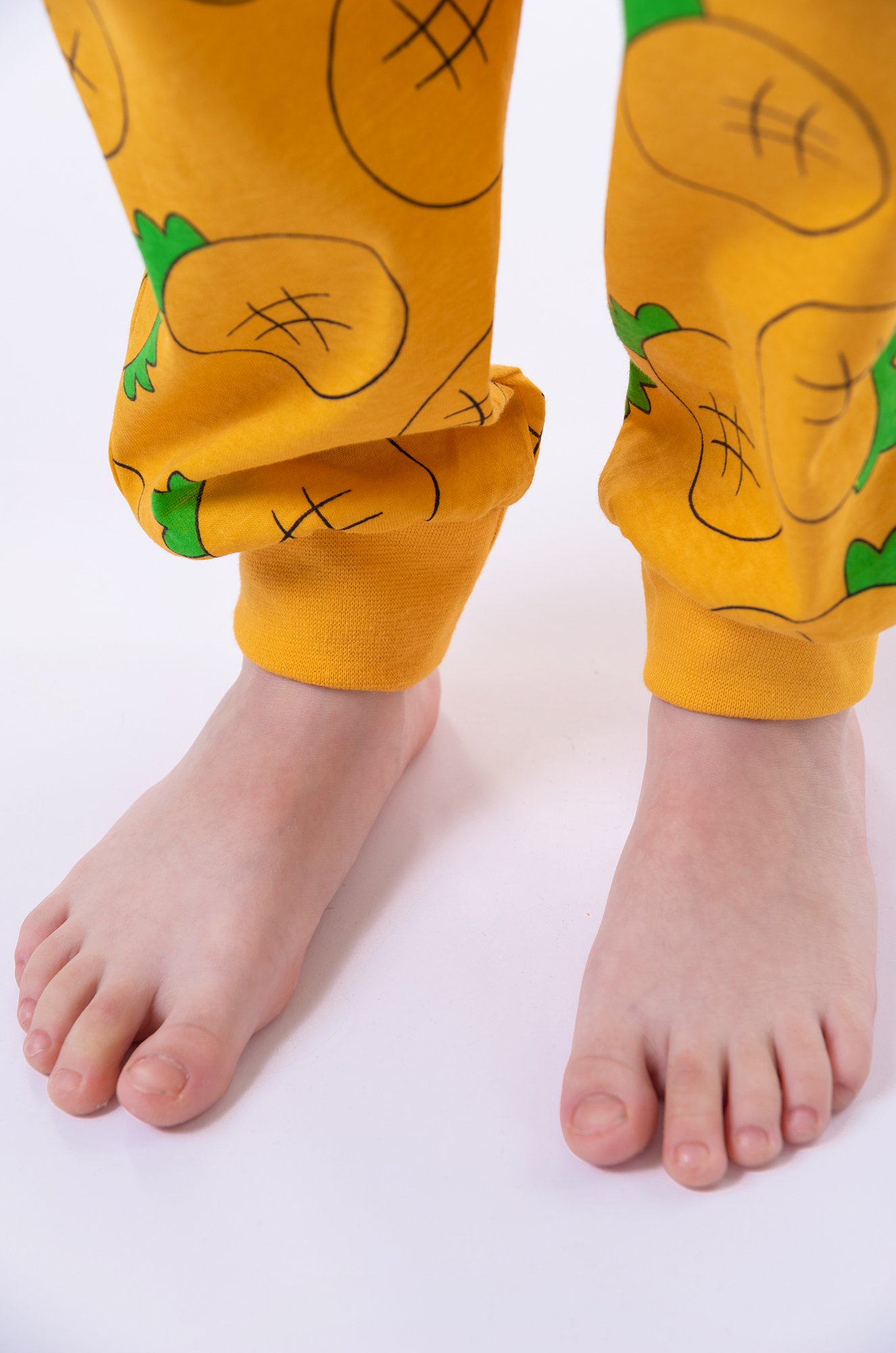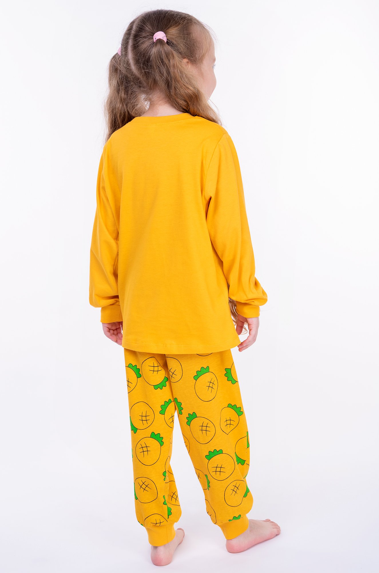 Мягкая пижама для девочки сшита из трикотажа кулирная гладь. Приятный на ощупь 100% хлопок позволяет нежной коже дышать, прекрасно держит форму, сохраняет цвет даже после многочисленных стирок. Домашний костюм выполнен в желтом цвете и украшен милым принтом ананасы.
