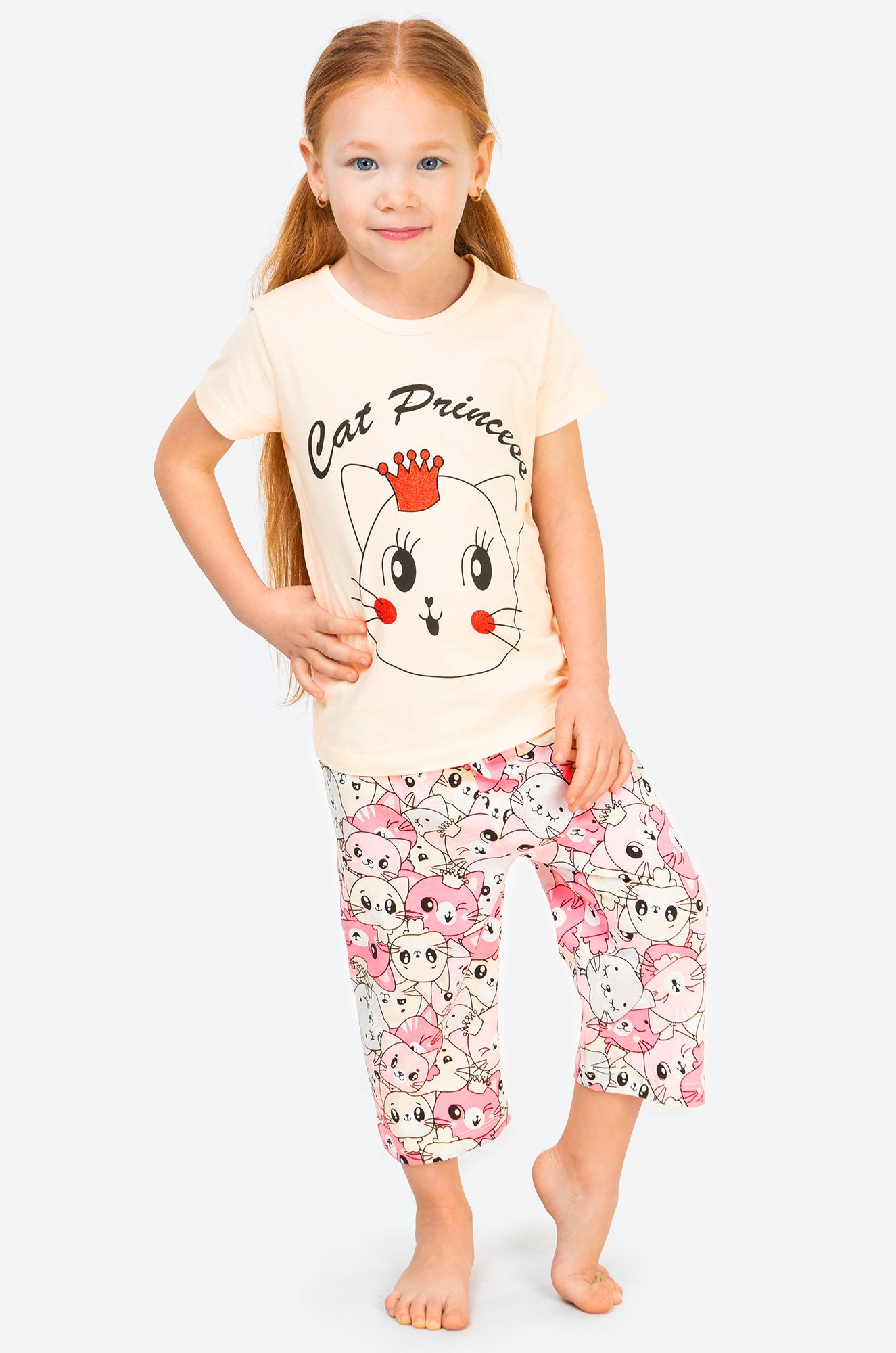 Детская хлопковая пижама украшена милым принтом кошечки.