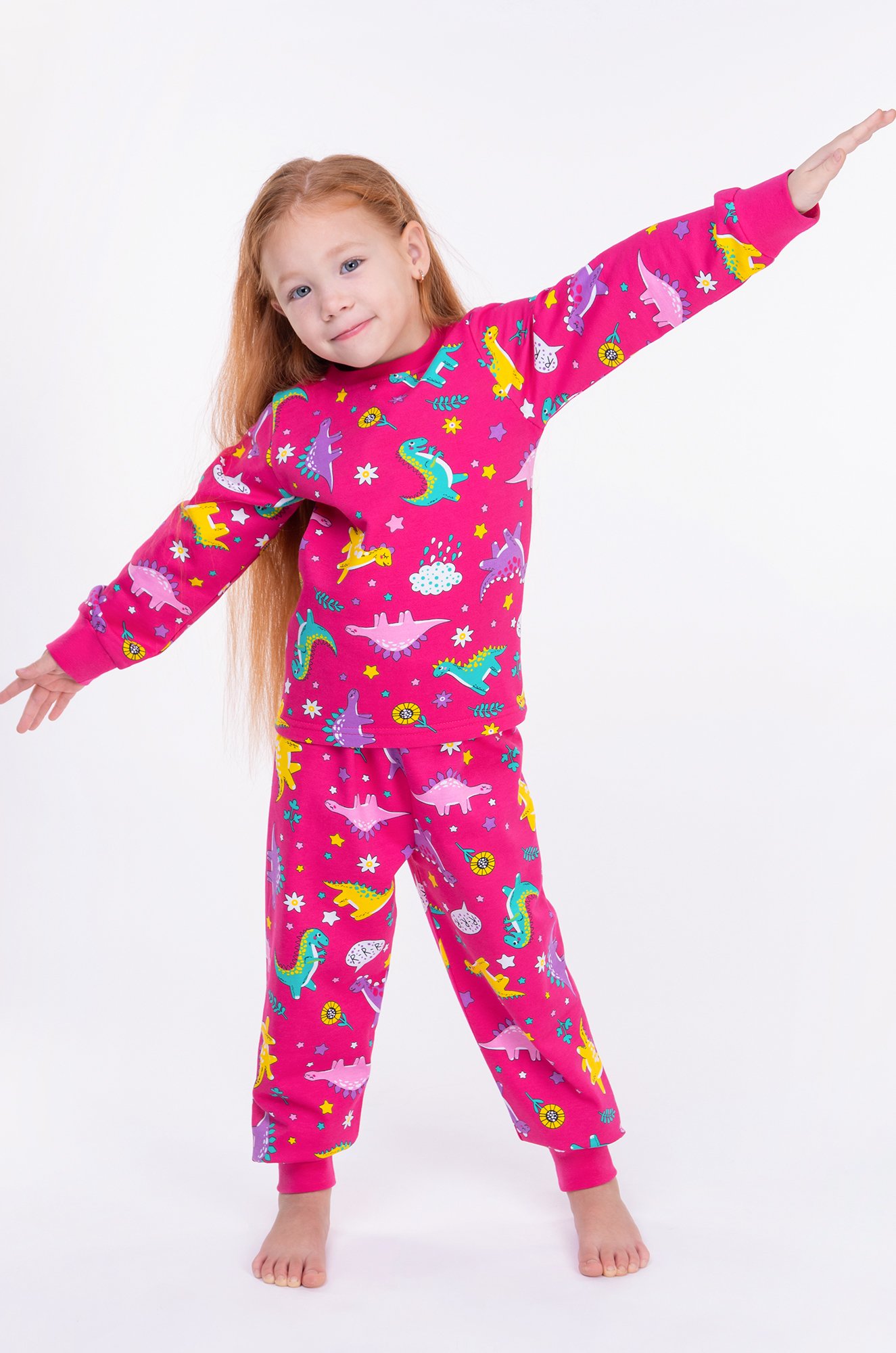 Мягкая, теплая пижама для девочки сшита из трикотажа футер двухнитка с начесом. Приятный на ощупь 100% натуральный хлопок позволяет нежной коже дышать, держит форму, сохраняет цвет даже после многочисленных стирок. Домашний костюм выполнен в цвете фуксия и украшен милым принтом динозавры.