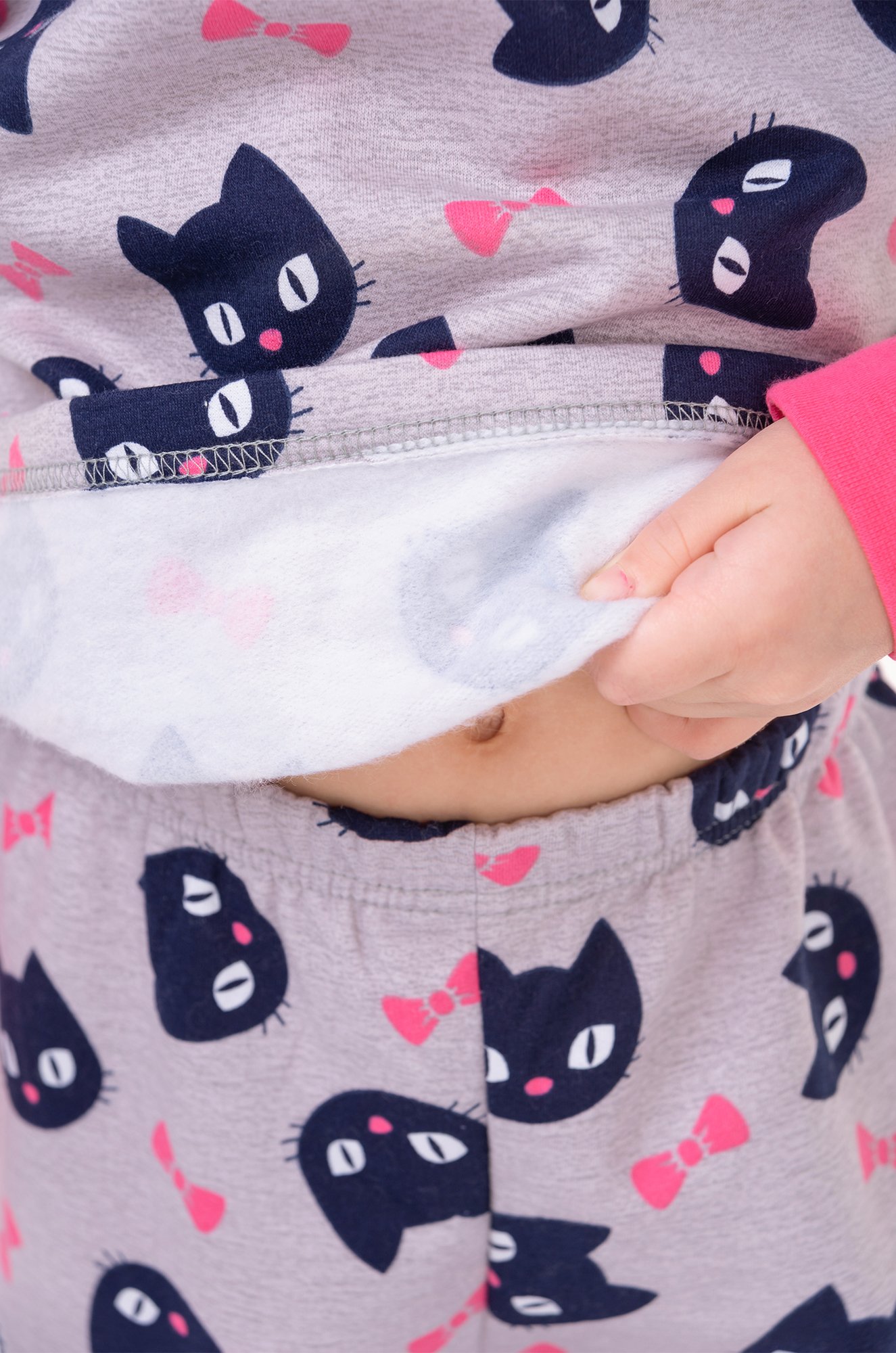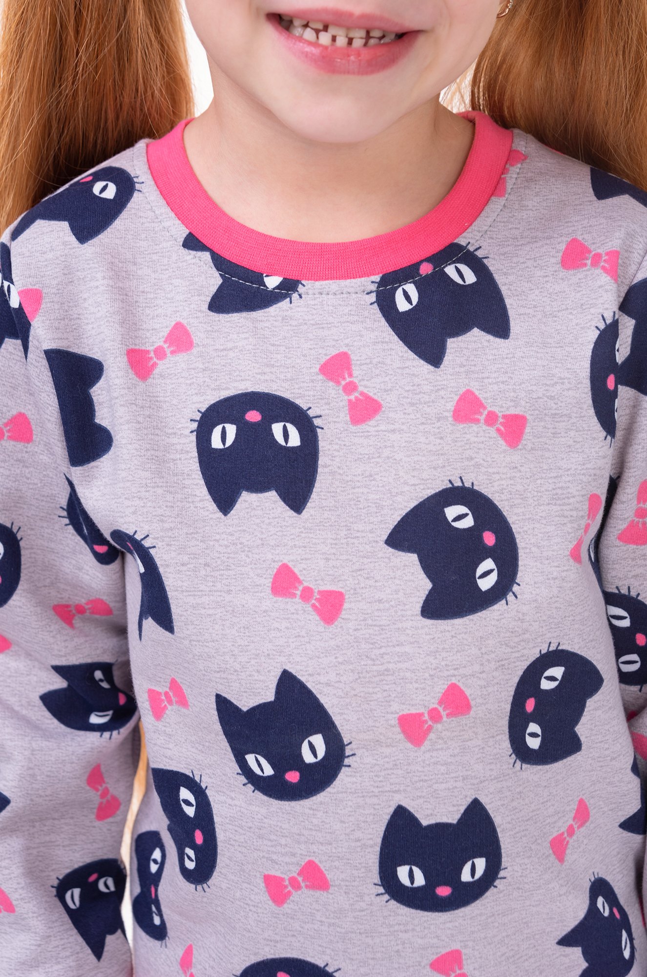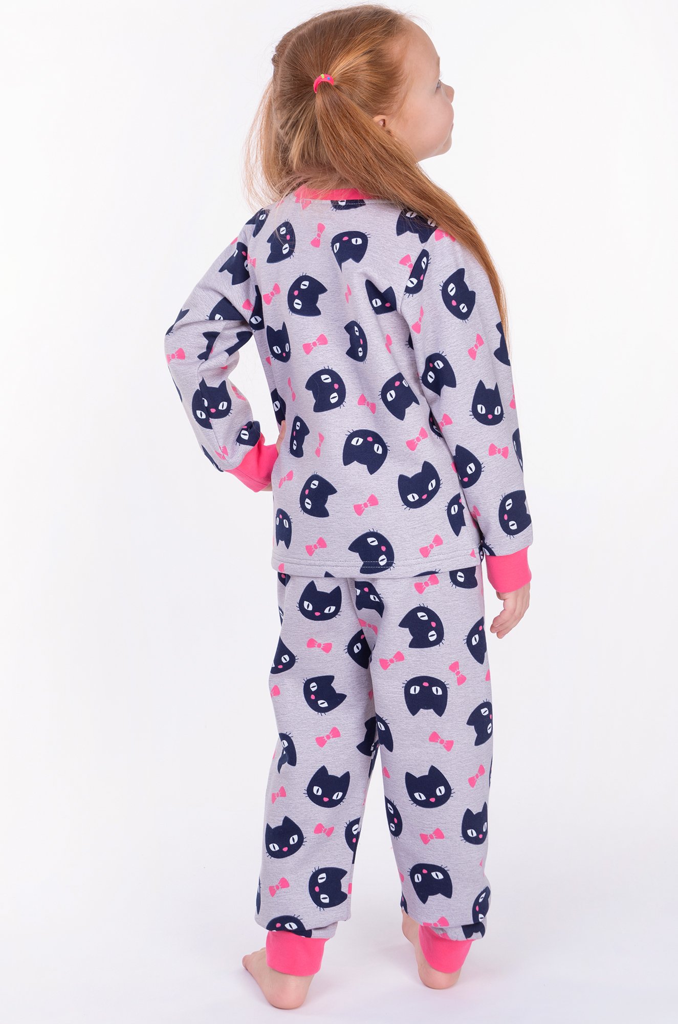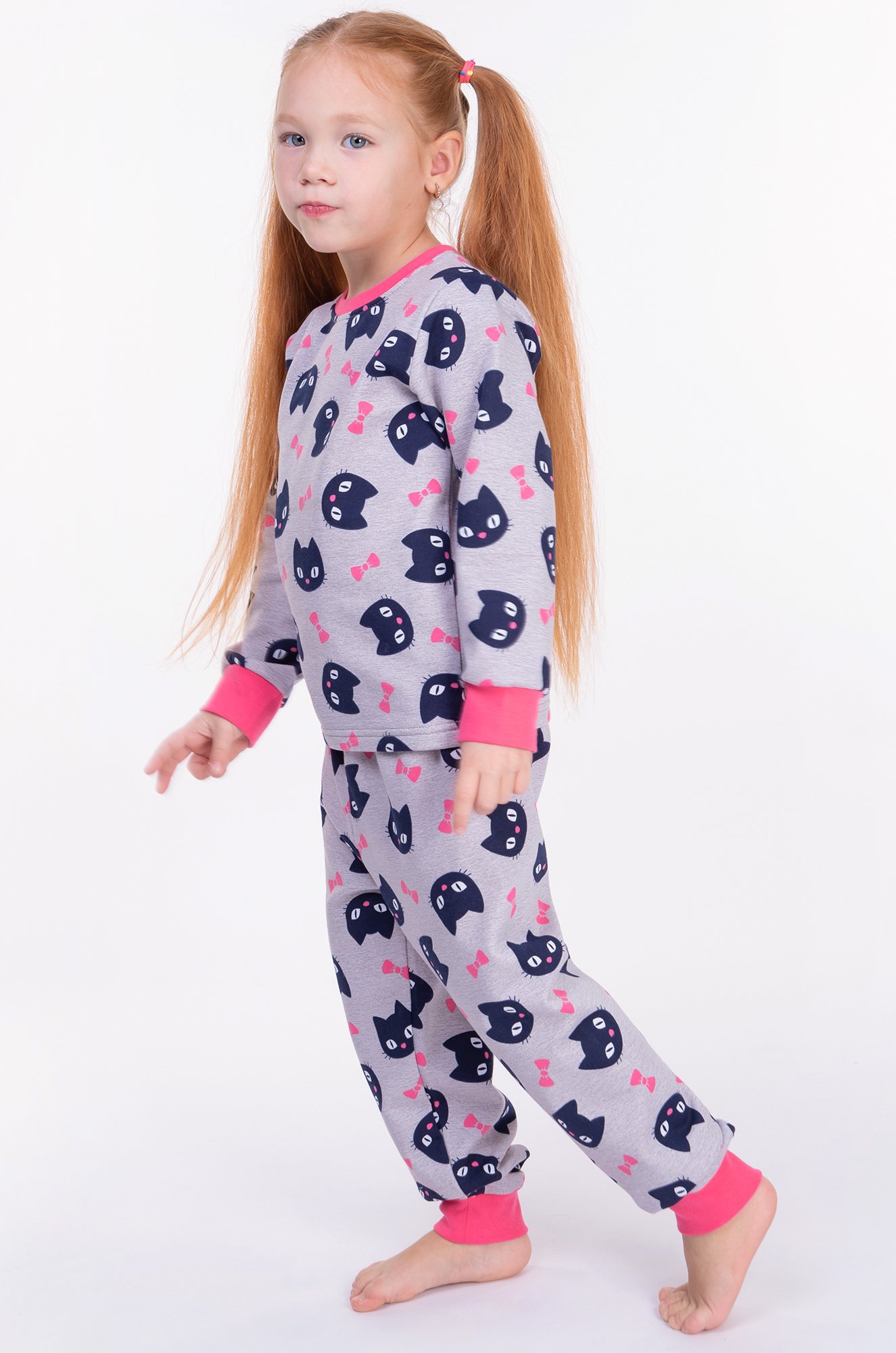 Мягкая, теплая пижама для девочки сшита из трикотажа футер двухнитка с начесом. Приятный на ощупь 100% натуральный хлопок позволяет нежной коже дышать, держит форму, сохраняет цвет даже после многочисленных стирок. Домашний костюм выполнен в сером цвете и украшен милым принтом котики.