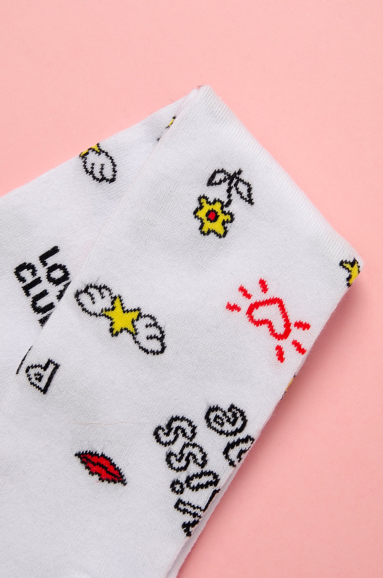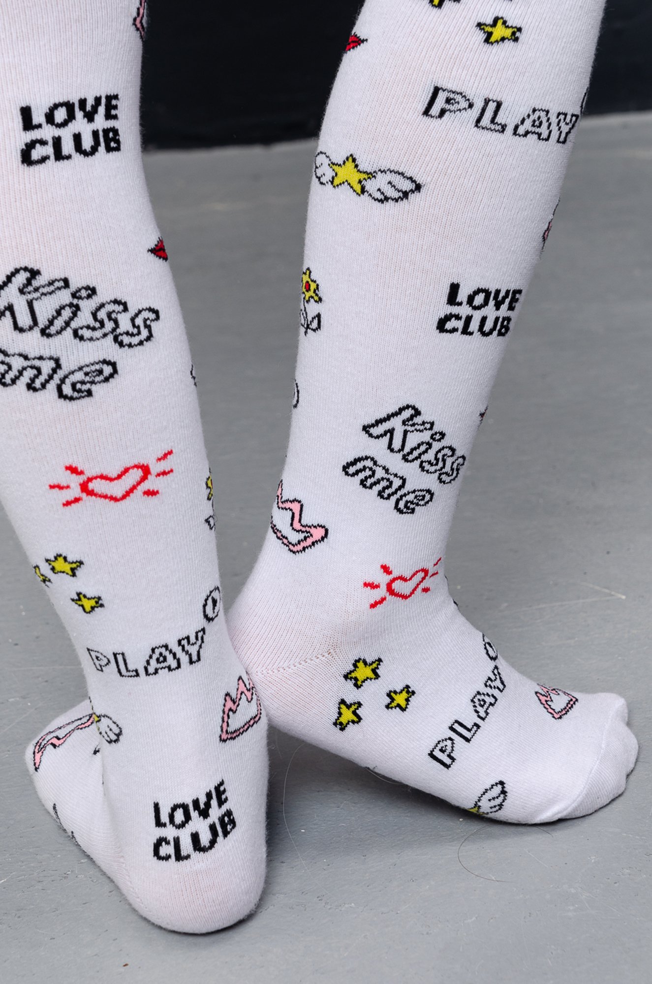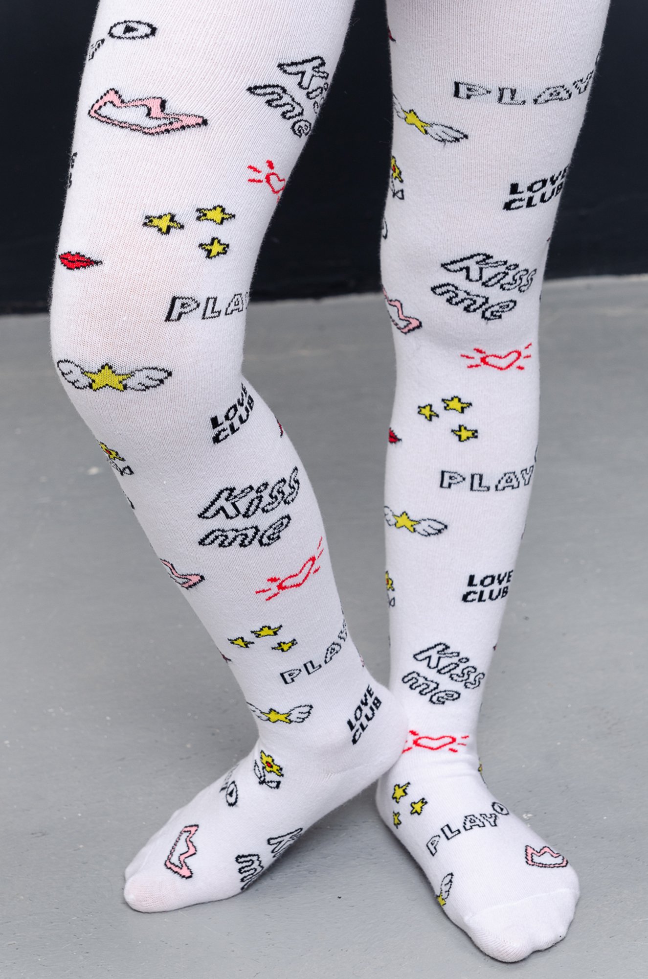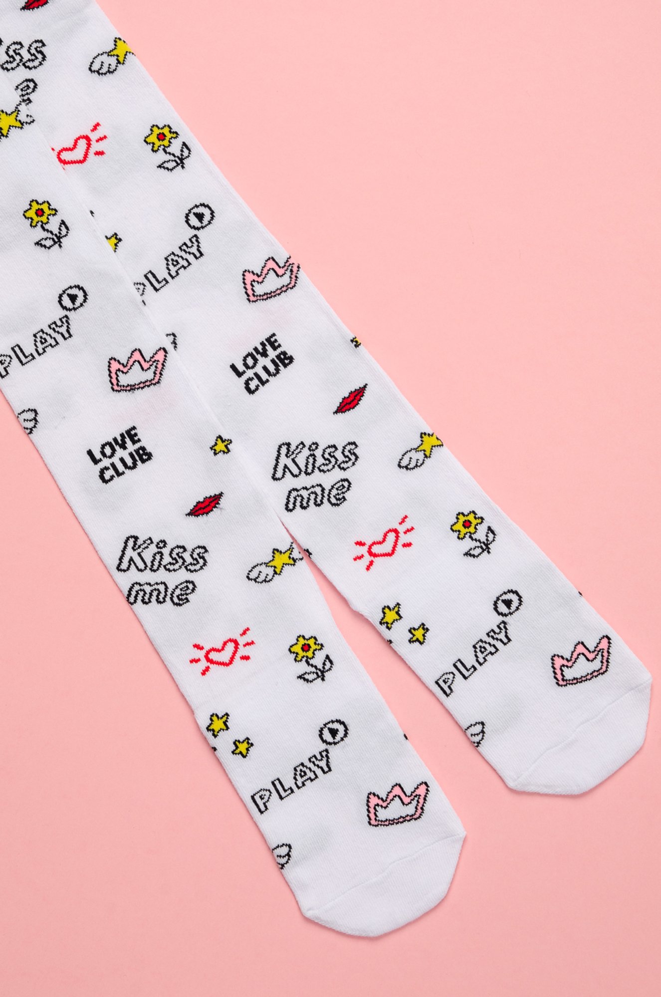Белые колготки с яркими рисунками и надписями для девочки. Детские колготки с высоким содержанием хлопка и добавлением синтетических нитей для лучшего сохранения первоначальной формы.