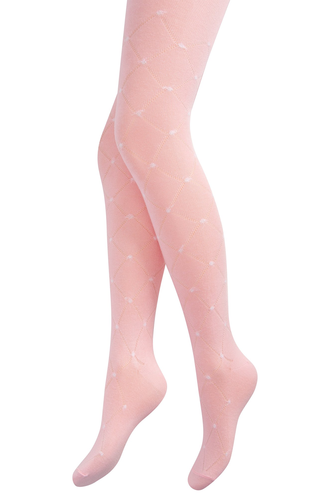 Нарядные колготки с ажурным рисунком ромбы и крапинкой для девочек. Выполнены из пряжи с высоким содержанием хлопка. Натуральный хлопок позволяет коже дышать, добавление безопасного эластана защищает от деформации и увеличивает срок службы детских колготок. Высокая посадка, мягкая резинка в поясе, удобная ластовица. Колготки плотно облегают ножку, не крутятся. Мягкие и удобные, в них будет комфортно весь день.