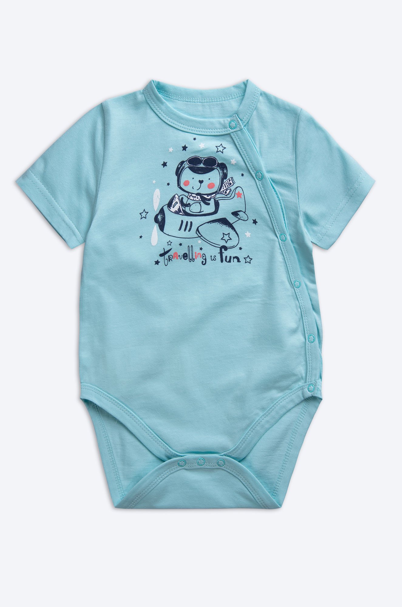Боди с коротким рукавом для новорожденных мальчиков сшито из 100% натуральной хлопковой ткани кулирная гладь. Детский полукомбинезон для мальчика украшен принтом мишка летчик.
