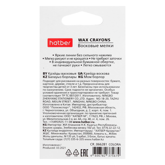 Восковые мелки идеально подходят для детского творчества. Предназначены для рисования на бумаге любого типа, а также дереве, картоне и стекле. Не пачкают руки, благодаря индивидуальной бумажной обертке каждого карандаша.