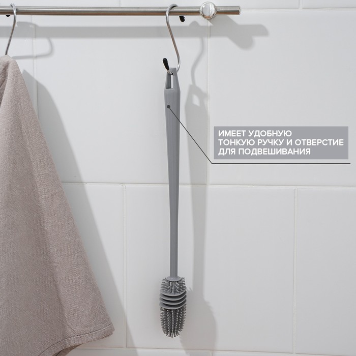 - Ёршик имеет удобную тонкую ручку и отверстие для подвешивания, можно хранить в подвешенном положении.