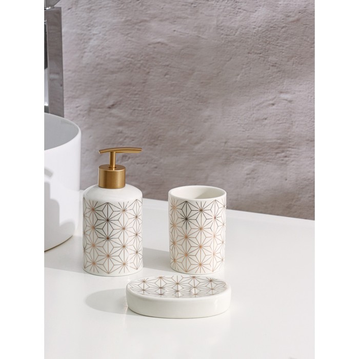 Набор аксессуаров организует пространство и станет стильным украшением Вашей ванной комнаты. За счет сдержанного дизайна данный керамический набор в ванную подойдет к любому дизайну ванной комнаты. Набор состоит из 3 предметов: дозатор, мыльница, стакан.