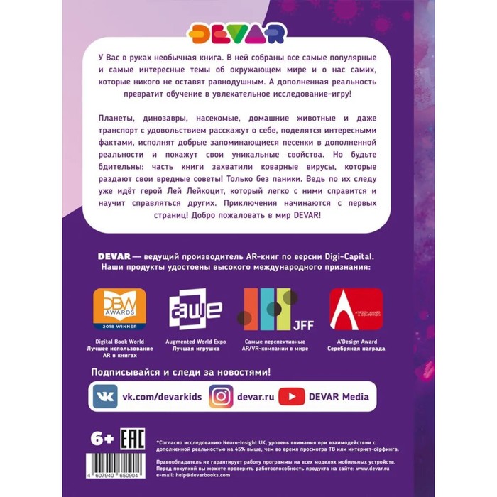 «Моя первая БОЛЬШАЯ энциклопедия DEVAR» — это книга первых знаний малыша об окружающем мире. Она состоит из семи блоков, которые раньше издавались в виде отдельных книг, а теперь для вашего удобства объединились под одной обложкой в большом подарочном издании: «Космос», «Динозавры», «Насекомые», «Животные», «Моё тело», «Транспорт», «Вирусы». И в каждом из них — герои, которые рассказывают факты о себе от первого лица! Авторы книги придумали ярких персонажей с запоминающимися характерами, а дизайнеры сделали стилизованные иллюстрации, благодаря которым даже отталкивающие персонажи (например, тараканы, хищные динозавры или вирусы) становятся чрезвычайно симпатичными.