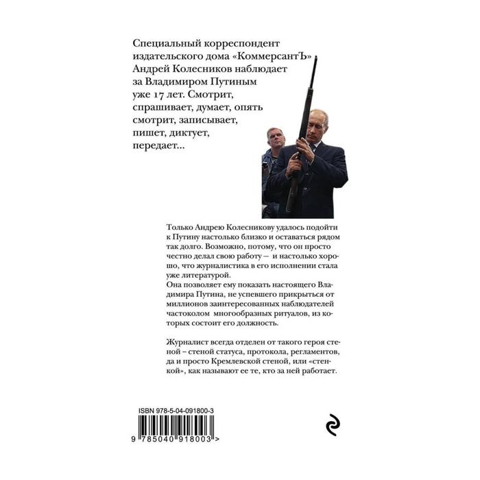 Специальный корреспондент издательского дома КоммерсантЪ Андрей Колесников наблюдает за Владимиром Путиным уже 17 лет. Смотрит, спрашивает, думает, опять смотрит, записывает, пишет, диктует, передает…Только Андрею Колесникову удалось подойти к Путину настолько близко и оставаться рядом так долго. Возможно, потому, что он просто честно делал свою работу — и настолько хорошо, что журналистика в его исполнении стала уже литературой. Она позволяет ему показать настоящего Владимира Путина, не успевшего прикрыться от миллионов заинтересованных наблюдателей частоколом многообразных ритуалов, из которых состоит его должность. Журналист всегда отделен от такого героястеной - стеной статуса, протокола, регламентов, да и просто Кремлевской стеной, или стенкой, как называют ее те, кто за ней работает.