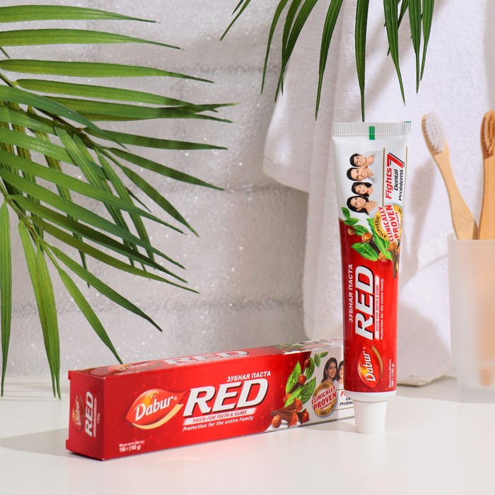 Основные преимущества и элементы зубной пасты Dabur Red: натуральный состав (никаких красителей и консервантов). Безопасно для эмали зубов. Мягкая защита полости рта. Широкое антисептическое воздействие, приводящее к прекращению в полости рта инфекционных заболеваний. Гвоздика предотвращает разрушение зубов. Мята оказывает противогрибковое и антибактериальное действие. Корень сутхи - антибактериальное и противовоспалительное средство. Длинный перец (пиппали) и чёрный перец освежают дыхание, являются антибактериальными средствами. Лаванга - облегчает зубную боль. Томар - антисептик, также освежающий дыхание.- Камфора - местный анальгетик, антисептик.- Карпура - анальгетик, антисептик. Харитаки - вяжущее средство, помогающее при стоматите. Марича освежает дыхание, является антибактериальным средством.