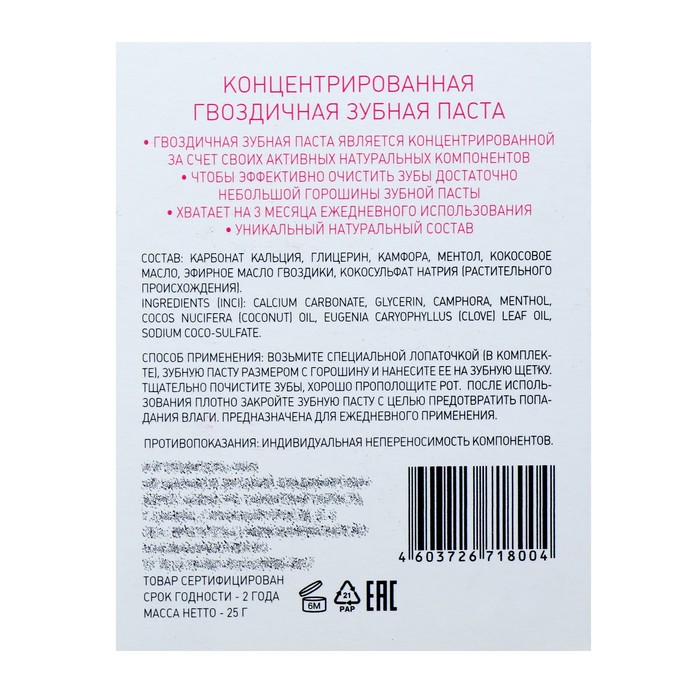 Состав: карбонат кальция, глицерин, камфора, ментол, кокосовое масло, борнеол, эфирное масло гвоздики, кокосульфат натрия(растительного происхождения).