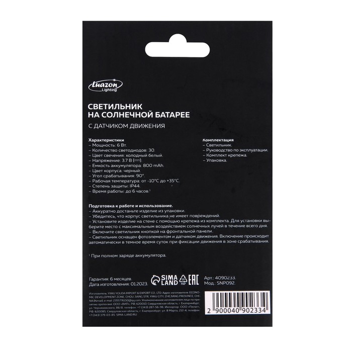Садовый светильник на солнечной батарее с датчиком движения, накладной, 9-5 × 13 × 5 см, 150 LED, свечение белое