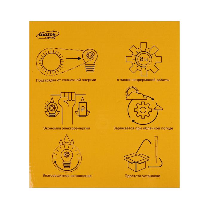 Изделие быстро и легко устанавливается в грунт с помощью штыря и не требуют подключения к электрической сети. Полного заряда аккумулятора хватает для работы фонаря в течение 6 часов.