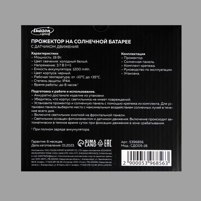 Светодиодный прожектор на солнечной батарее 18 Вт, выносная панель, 15 × 11 × 4 см, 6500К
