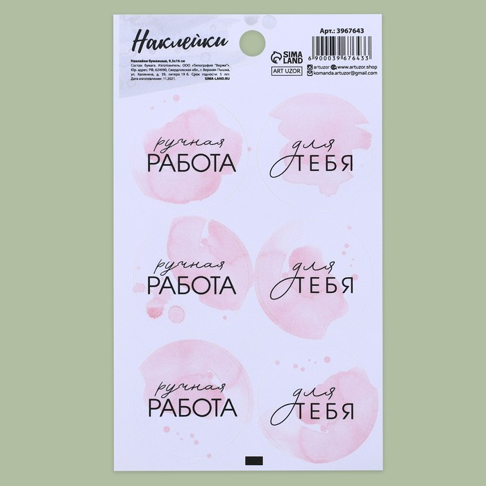 Наклейки на подарки «Ручная работа», 9 × 16 см