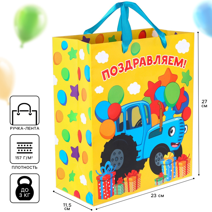 Пакет ламинат вертикальный Поздравляем!, Синий трактор, 23х27х11,5 см